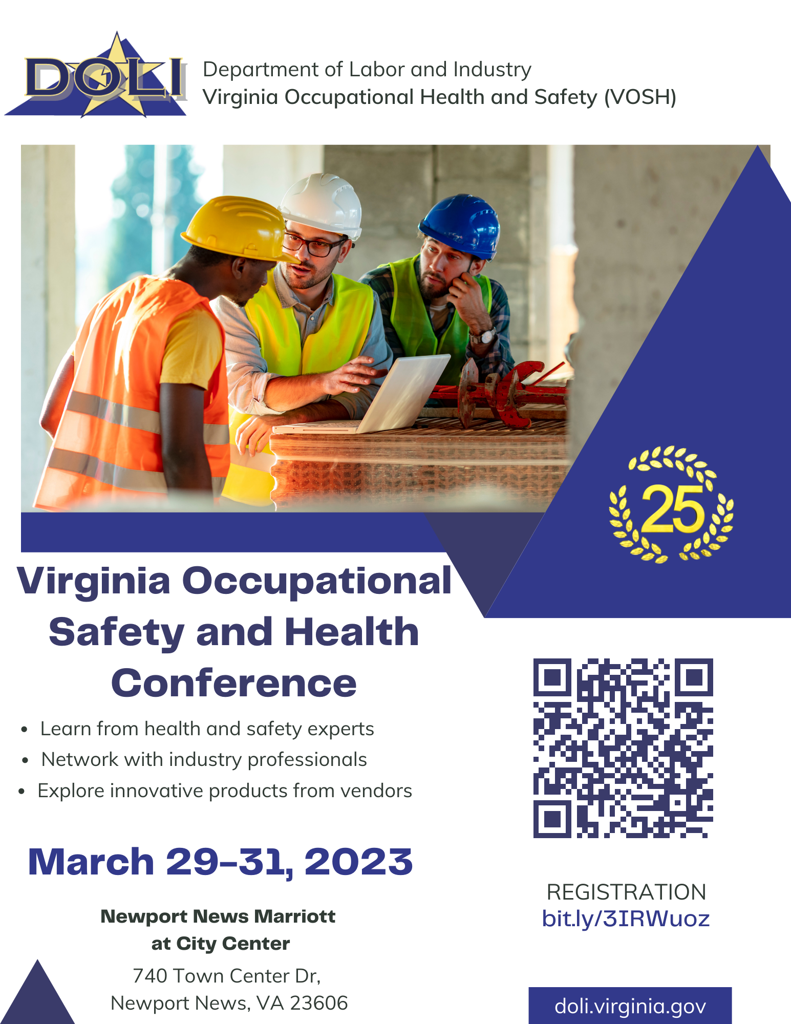The VOSH Safety and Health Conference, March 29-31, 2023, provides low-cost training for employers and employees in Virginia. Attendees have the opportunity to hear presentations from experts in the field, network with other professionals, and meet with vendors. Pre-Conference OSHA 10 Hour courses will be offered for General Industry, Construction, and Spanish Construction. These Classes Begin On Tuesday, March 28, and conclude Wednesday morning March 29.